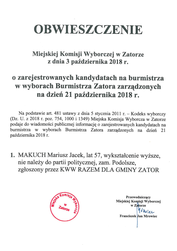 OBWIESZCZENIE o zarejestrowanych kandydatach na burmistrza w wyborach na Burmistrza Zatora 2018-10-04
