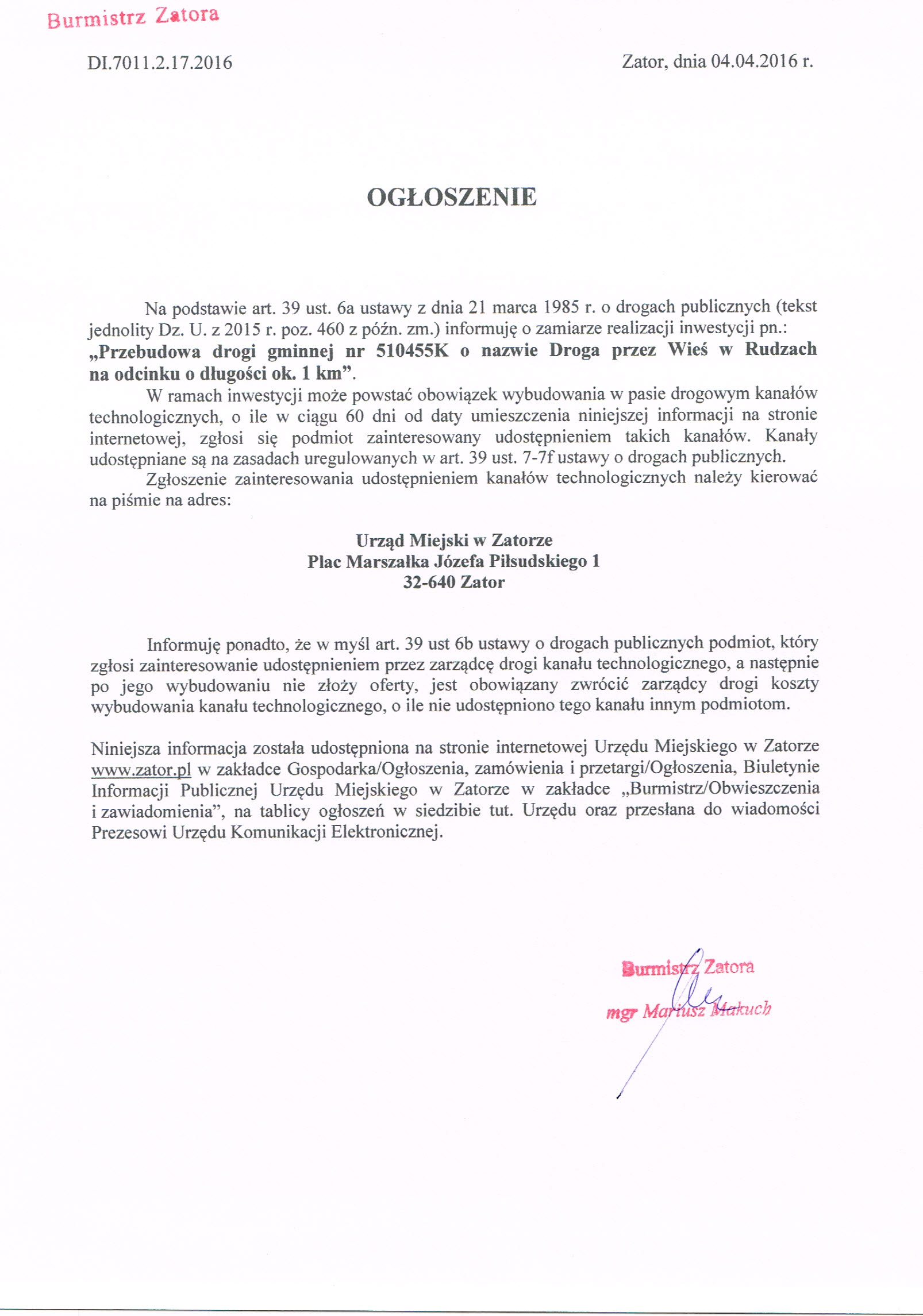 OGŁOSZENIE Burmistrza Zatora z dnia 4 kwietnia 2016r 2016-04-06