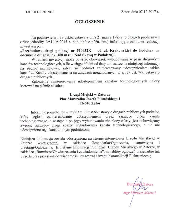 OGŁOSZENIE o zamiarze realizacji inwestycji pn.: ,,Przebudowa drogi gminnej nr 510452K — od ul. Krakowskiej do Podolsza na odcinku o długości ok. 180 m (ul. Nad Skawą w Podolszu)”