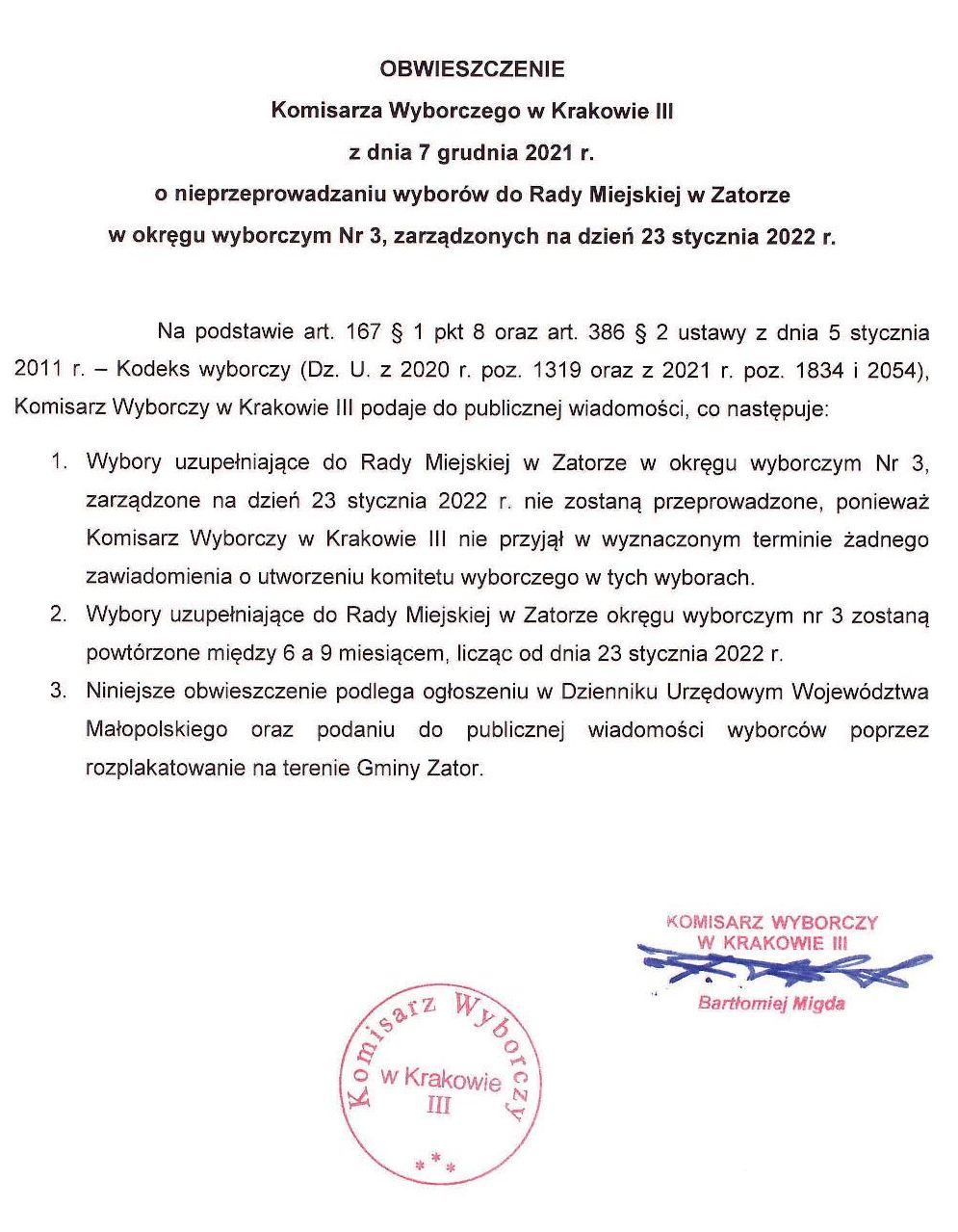 Obwieszczenie Komisarza Wyborczego o nieprzeprowadzaniu wyborów do Rady Miejskiej w Zatorze 2021-12-08