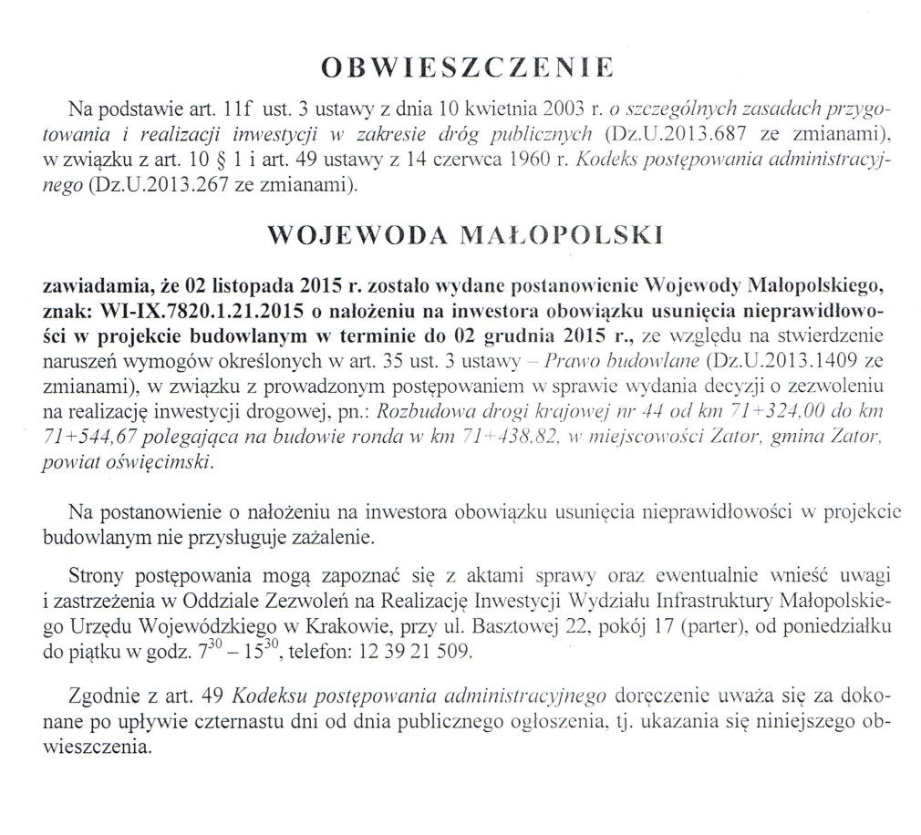 Obwieszczenie: postanowienie Wojewody Małopolskiego 2015-11-03