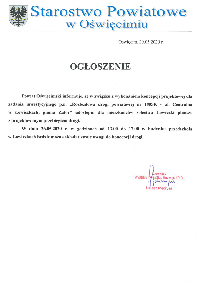 Ogłoszenia w sprawie ul. Centralnej w Łowiczkach 2020-05-20