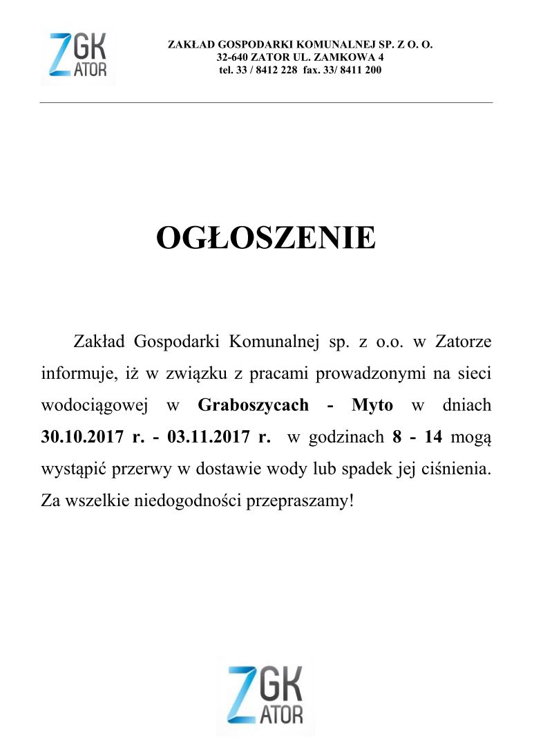 Ogłoszenie ZGK sp. z o.o. dot. przerwy w dostawie wody lub spadek jej ciśnienia w Graboszycach - Myto od 30.10. -03.11.2017 r.