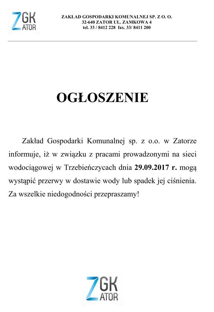 Ogłoszenie ZGK sp. z o.o. dot. przerwy w dostawie wody lub spadek jej ciśnienia w Trzebieńczycach 29.09.2017 r. 2017-09-28