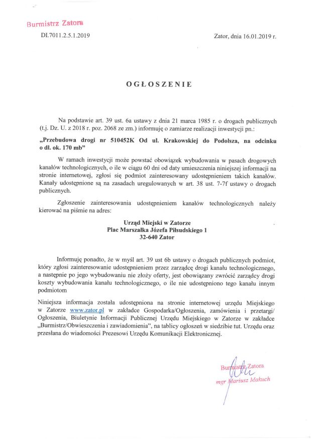 Ogłoszenie: udostępnienie kanalów technologicznych - Przebudowa drogi nr 510452K Od ul. Krakowskiej do Podolsza, na odcinku o dł. ok 170 mb