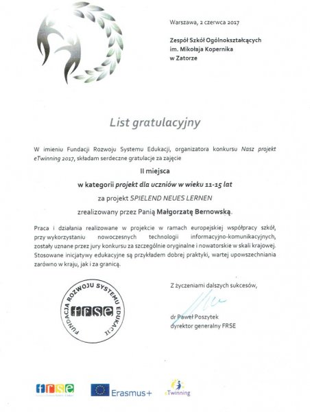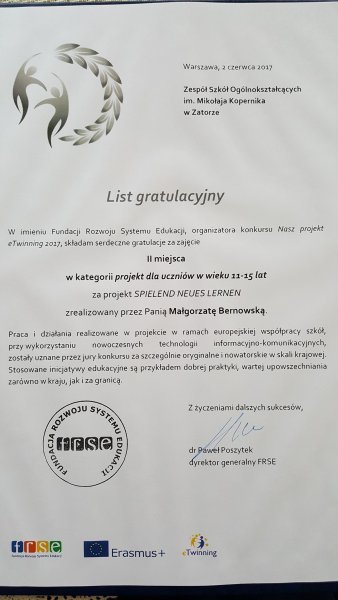 Ogólnopolski Konkurs eTwinning – II miejsce dla projeku „Spielend Neues lernen” dla ZSO Zator