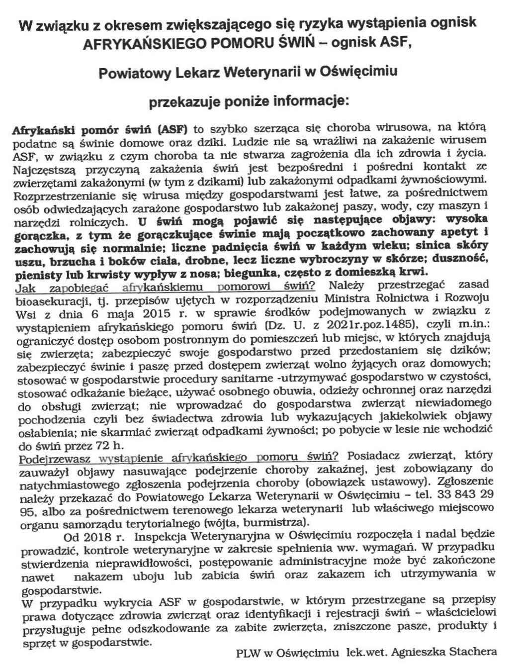 Informacja Powiatowego Lekarza Weterynarii w Oświęcimiu