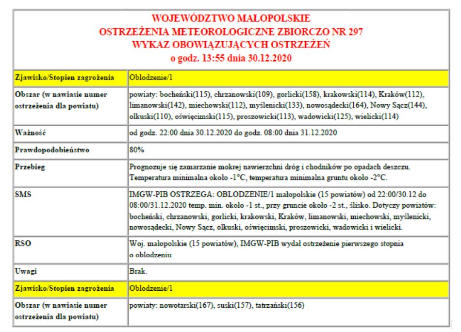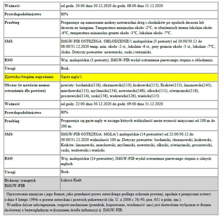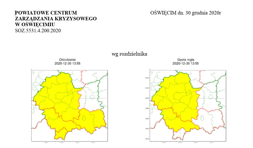 Ostrzeżenie Meteorologiczne 297 Oblodzenie 1 i Gęsta mgła 2020-12-30