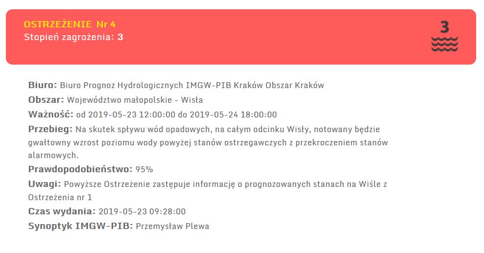 Ostrzeżenie hydrologiczne Stopień zagrożenia: 3 2019-05-23