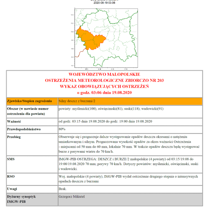 Ostrzeżenie meteo: silny deszcz z burzami/2 2020-08-19