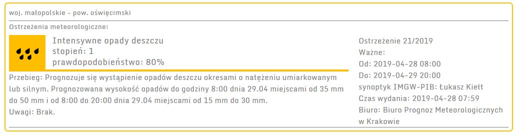 Ostrzeżenie meteorologiczne: Intensywne opady deszczu stopień: 1 2019-04-29