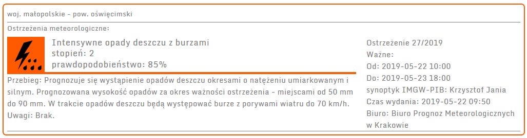 Ostrzeżenie meteorologiczne: Intensywne opady deszczu z burzami stopień: 2 2019-05-22