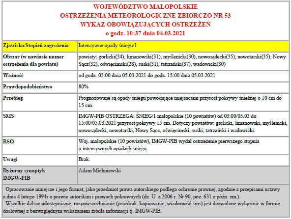 Ostrzeżenie meteorologiczne: Intensywne opady śniegu/1 2021-03-04