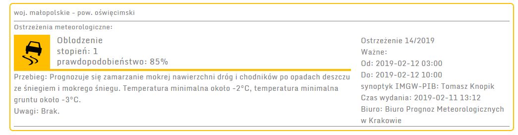 Ostrzeżenie meteorologiczne: Oblodzenie stopień: 1 2019-02-11
