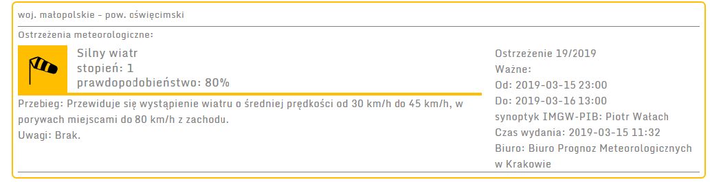 Ostrzeżenie meteorologiczne: Silny wiatr stopień: 1 2019-03-16
