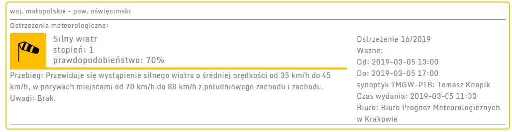 Ostrzeżenie meteorologiczne: Silny wiatr/1 2019-03-05
