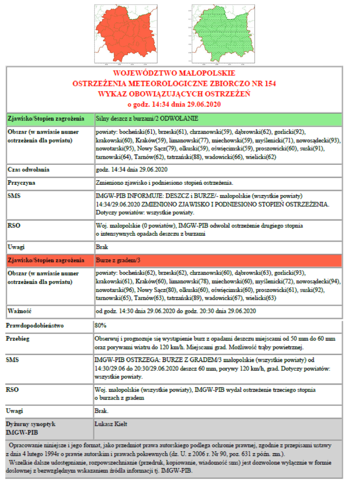 Ostrzeżenie meteorologiczne nr 154 o burzach z gradem trzeciego stopnia. 2020-06-29
