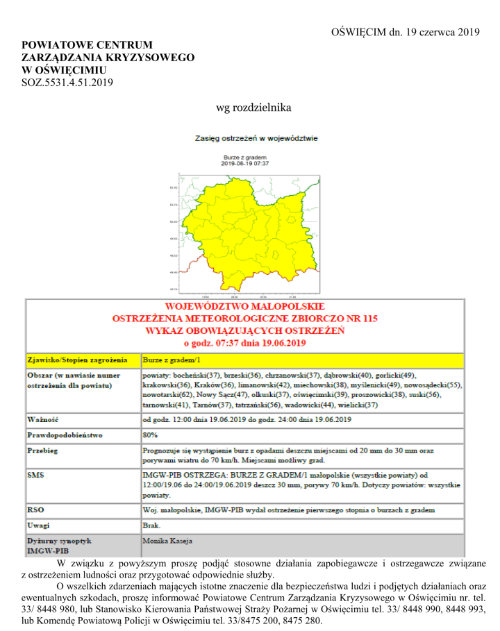Ostrzeżenie meteorologiczne nr 39. Burze z gradem 1 2019-06-19