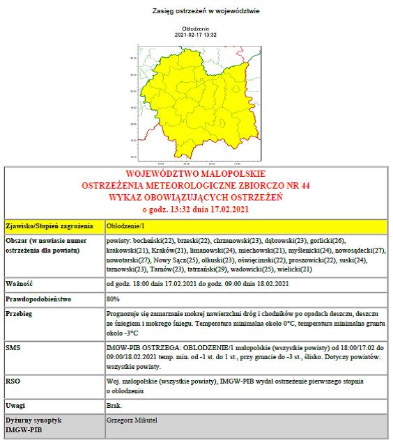 Ostrzeżenie meteorologiczne nr 44 Oblodzenie/1 2021-02-17