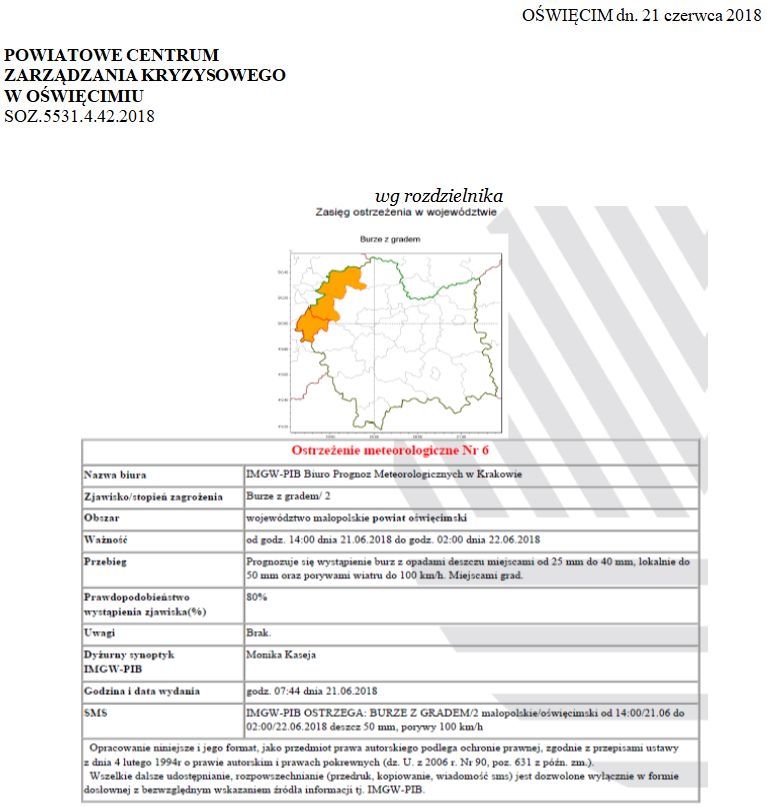 Ostrzeżenie meteorologiczne nr 6 -burze z gradem 2018-06-21
