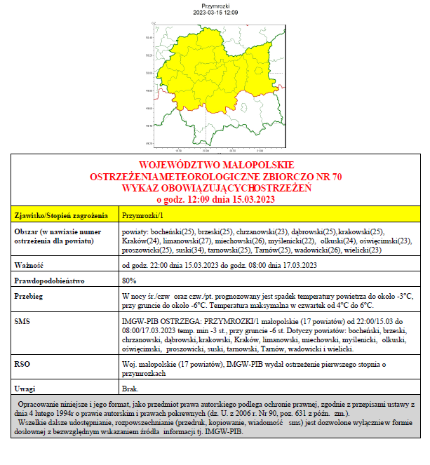 Przebieg : W nocy śr./czw oraz czw./pt. prognozowany jest spadek temperatury powietrza do około -3°C, przy gruncie do około -6°C. Temperatura maksymalna w czwartek od 4°C do 6°C