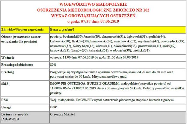 Ostrzeżenie meteorologiczne o burzach z gradem /1 2019-06-07