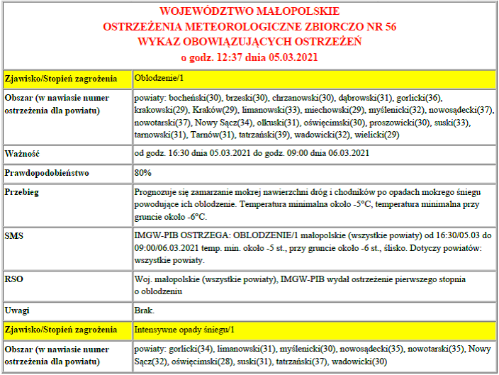 Ostrzeżenie meteorologiczne pierwszego stopnia o oblodzeniu/1 2021-03-05