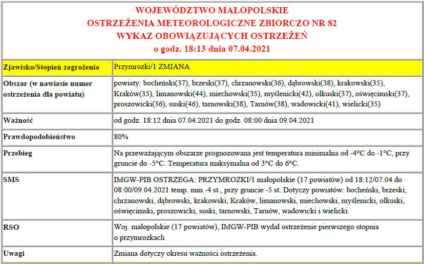 Ostrzeżenie meteorologiczne pierwszego stopnia o przymrozkach 2021-04-08