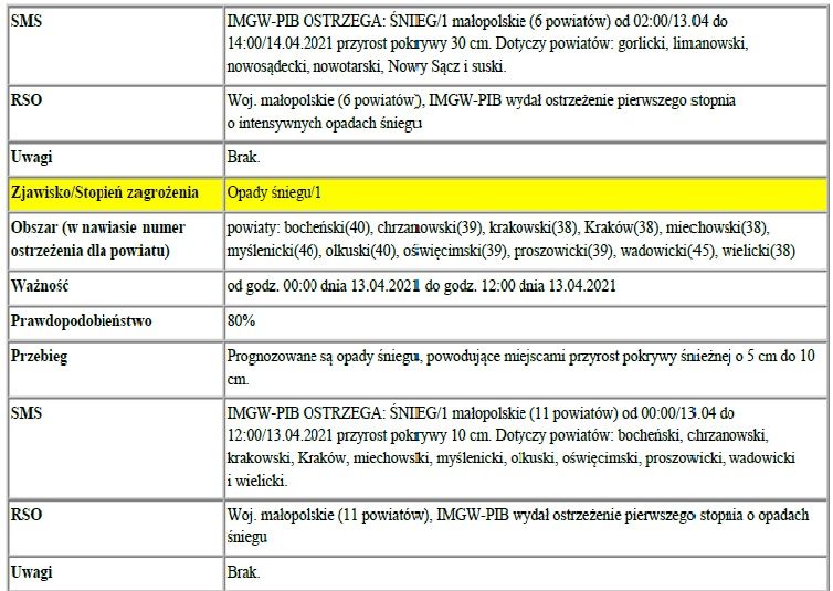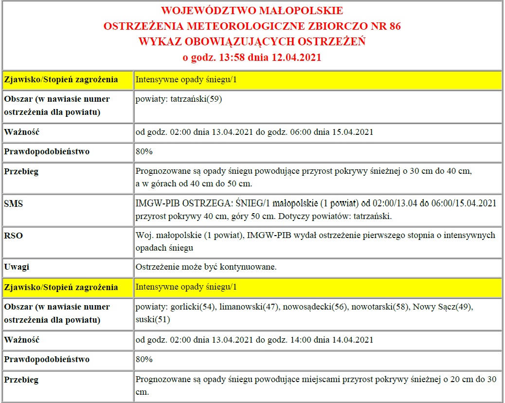 Ostrzeżenie meteorologiczne zbiorcze nr 86 o opadach śniegu i przymrozkach pierwszego stopnia 2021-04-13