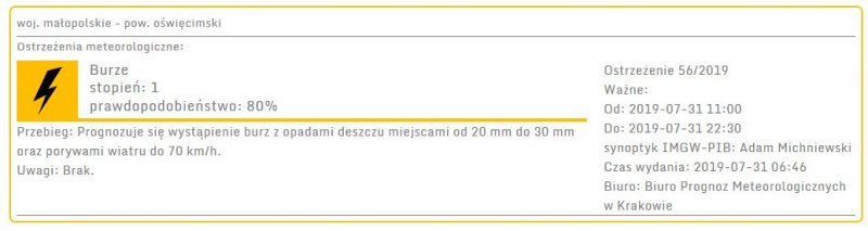 Ostrzeżenie meteorologiczne zbiorcze o burzach /1 2019-07-31