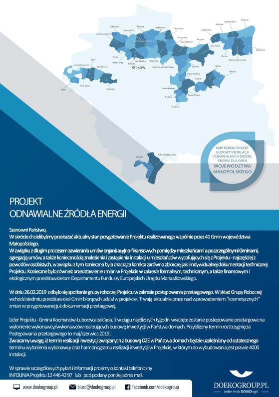 Projekt pn. „Partnerski Projekt Budowy Instalacji Odnawialnych Źródeł Energii dla Gmin Województwa Małopolskiego” jest współfinansowany przez Unię Europejską ze środków Europejskiego Funduszu Rozwoju Regionalnego w ramach Regionalnego Programu Operacyjnego Województwa Małopolskiego na lata 2014-2020