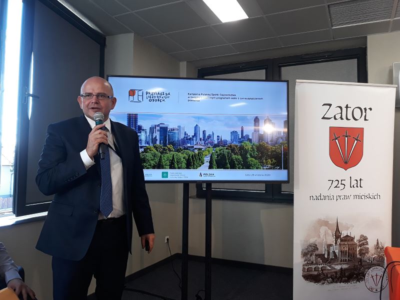 Podczas swojego wystąpienia Burmistrz Zatora Mariusz Makuch poinformował o wsparciu działań Gminy Zator w przeciwdziałaniu i walce z zanieczyszczonym powietrzem. Od ponad dwóch lat na terenie Gminy Zator realizowany jest program udzielania dotacji do wymiany starych kotłów zasilanych paliwem stałym a liczba chętnych na wymianę pieców stale rośnie. Od początku realizacji projektu z gminnego programu dotacyjnego skorzystało już 111 właścicieli nieruchomości likwidując niskosprawne kotły. Dzięki realizacji autorskiego programu z roku na rok poprawiamy stan zanieczyszczenia powietrza na terenie Gminy Zator