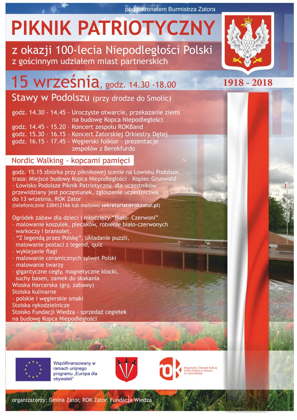 15 września 2018 na Łowisku w Podolszu odbył się Piknik Patriotyczny zorganizowany z okazji 100 rocznicy odzyskania przez Polskę niepodległości. Wydarzenie to miało szczególny charakter, ponieważ do wspólnego świętowania zaproszono delegacje miast partnerskich z Berekfurdo (Węgry), Bojnic oraz Terchovej (Słowacja) w ramach projektu „For the Future” Europa dla Obywateli, Partnerstwo Miast współfinansowanego przez Unię Europejską. Piknik był okazją do zainaugurowania akcji sypania Kopca Niepodległości.