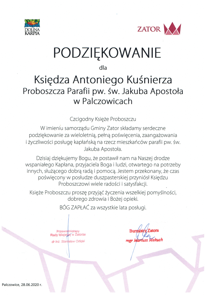 Podziękowanie dla Księdza Antoniego Kuśnierza Proboszcza Parafii pw. św. Jakuba Apostoła w Palczowicach 2020-06-26