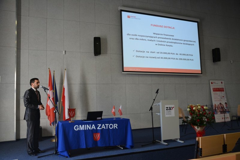 Podczas uroczystości otwarcia obiektu na sali audytoryjnej przedstawiono dwie prezentacje multimedialne. Pierwszą o projekcie ”Dolina Karpia szansa na przyszłość” zaprezentował Pan Piotr Domagała Koordynator Merytoryczny projektu – Kierownik Działu Rozwoju Oświaty i Zdrowia Urzędu Miejskiego w Zatorze. Prezentację o działalności Centrum oraz funkcjonalności obiektu przedstawił Pan Szymon Smreczyński Prezes Zatorskiej Agencji Rozwoju Sp. z o. o.