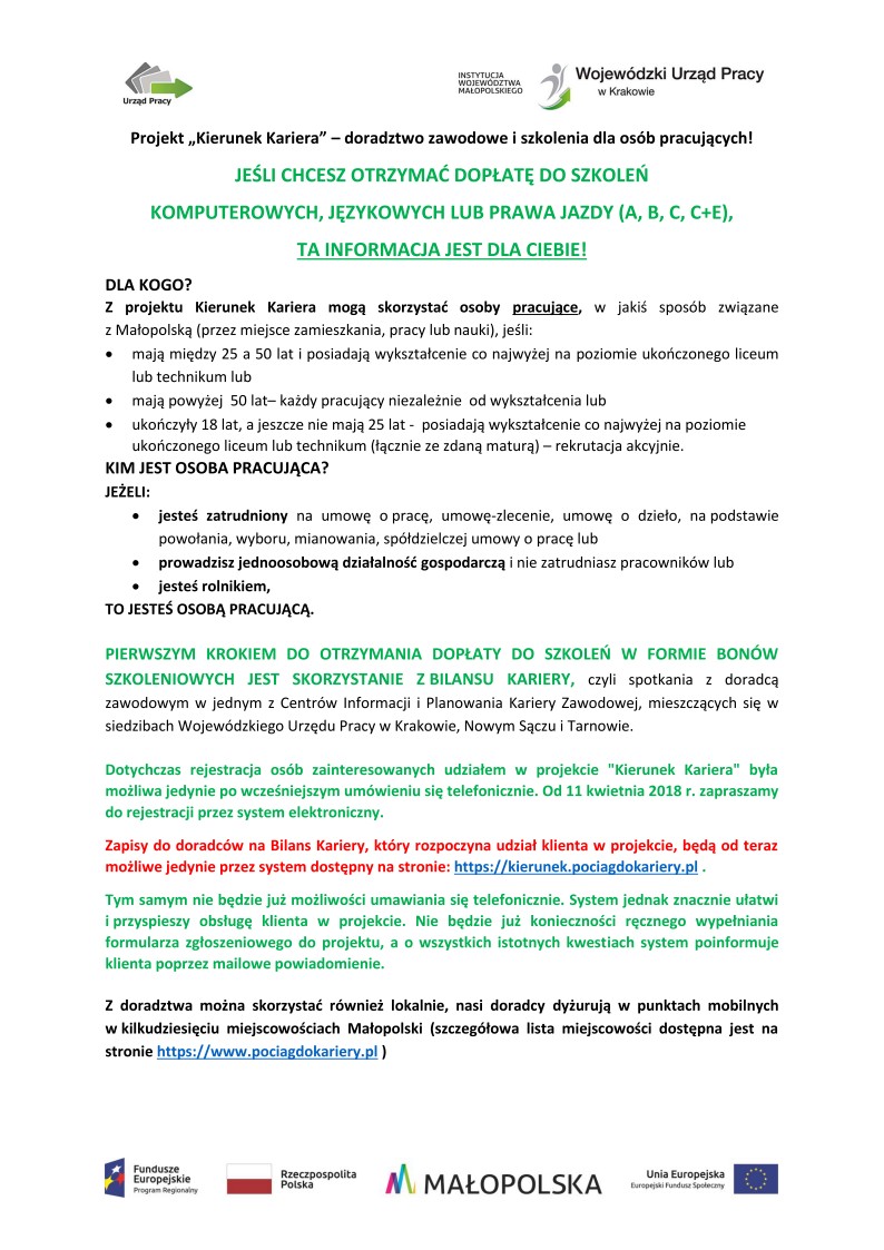Projekt „Kierunek Kariera” - doradztwo zawodowe i szkolenia dla osób pracujących! 2018-04-24