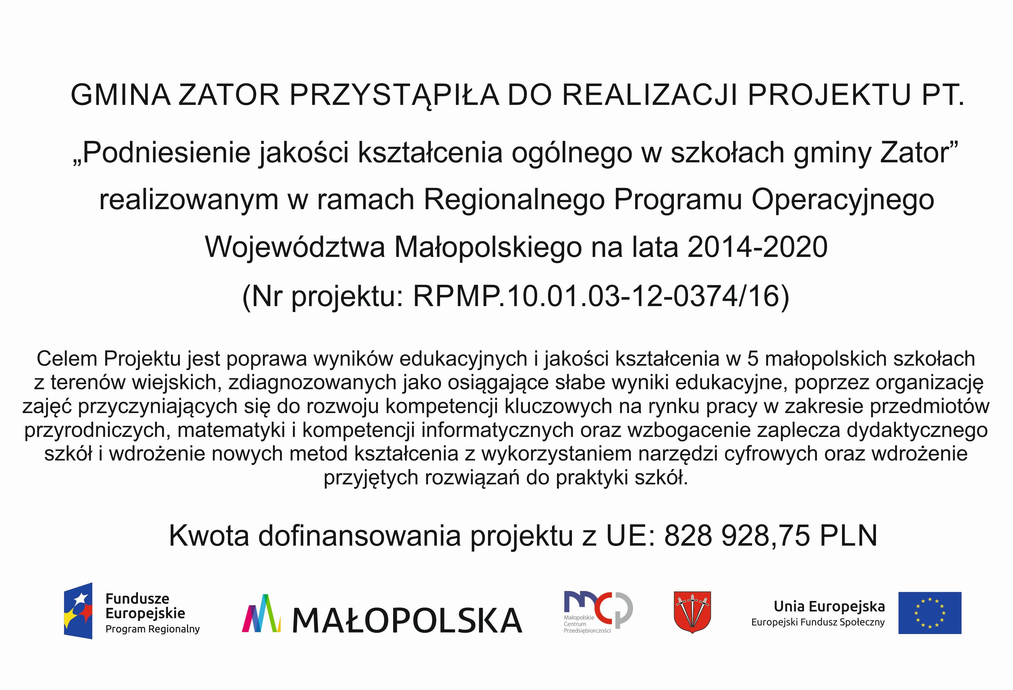 Przystąpienie Gminy Zator do Projektu: Podniesienie jakości kształcenia ogólnego w szkołach gminy Zator” realizowanym w ramach Regionalnego Programu Operacyjnego Województwa Małopolskiego na lata 2014-2020