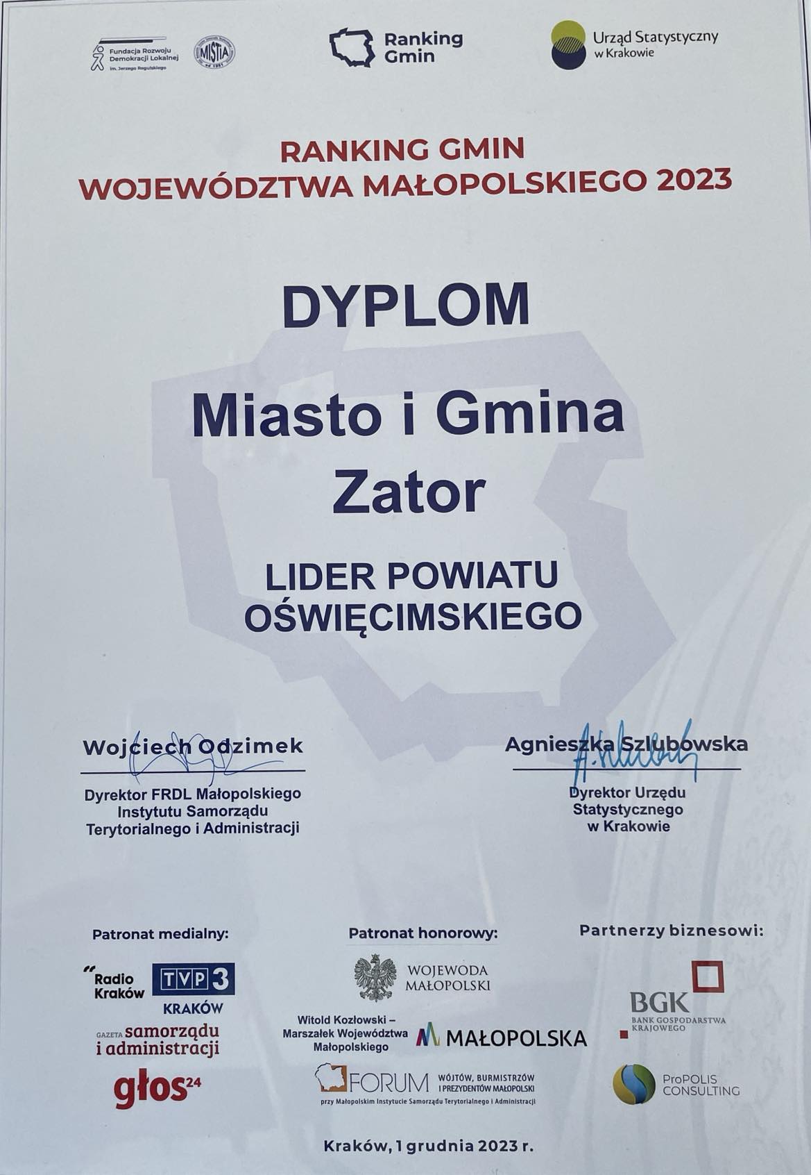 Miło mi poinformować, że Gmina Zator po raz drugi z rzędu uzyskała najwyższą lokatę w powiecie oświęcimskim. W zestawieniu wojewódzkim zajęliśmy, najwyższe w historii, szóste miejsce (na 179 gmin), wyprzedzając takie gminy jak Zakopane, Zielonki czy Oświęcim, Wadowice i Skawinę.