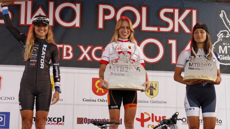 Po raz pierwszy od 2013 roku, kiedy to nasze zawodniczki jako jedyne w kraju zdobyły dwa złote medale, do kolekcji zatorskich kolarzy zawitał kolejny, wreszcie w ich koronnej dyscyplinie. W międzyczasie zdobywali wiele tytułów mistrza kraju w kolarstwie szosowym, przełajowym i maratonach, jednak na medal w MTB XCO należało czekać, aż 3 lata. Teraz klątwa zostaje przełamana za sprawą Rity Malinkiewicz. Na bardzo trudnej technicznie trasie Rita po starcie jechała na trzeciej pozycji, by po chwili objąć nawet prowadzenie w stawce zawodniczek do lat 23. Od 3 rundy nasza zawodniczka zajmowała drugą lokatę i nie oddała jej aż do mety. Mimo, że Rita jest aktualną Mistrzynią Polski w kolarstwie przełajowym, to jak sama przyznaje, srebro zdobyte w Gielniowie jest dla niej ważniejsze. Ostatnie tygodnie przed MP nie były optymalne w kontekście przygotowań naszej medalistki. Brak zgrupowania szkoleniowego i kontuzja, która stawiała pod znakiem zapytania walkę o tytuły Mistrza Polski, nie pomagały w walce o osiągnięcie wyznaczonego celu. Jednak włożona praca przyniosła efekt. Wielkie podziękowania dla wszystkich , którzy wspierają choćby dobrym słowem naszą pracę. To dla nich należy zadedykować nasze sukcesy. Podziękowania należą się również dla osób które przyczyniły się do szybkiej rehabilitacji naszej zawodniczki po groźnej kontuzji odniesionej podczas startu w Mistrzostwach Świata. W wyścigu w klasyfikacji open, zwyciężyła nasza kandydatka do medalu podczas Igrzysk Olimpijskich Rio 2016 – Maja Włoszczowska. Kolejna nasza zawodniczka, Dagmara Drabik zajęła dziesiątą lokatę w elicie kobiet.