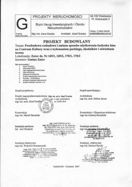 W dniu 5 stycznia 2009 r. zawarto umowę na przebudowę i rozbudowę istniejącego budynku gminnego (byłe kino Jaśmin) na Regionalny Ośrodek Kultury Doliny Karpia w Zatorze, wraz z infrastrukturą. Wartość robót po przetargu wynosi 2.414.258,00 zł. brutto.