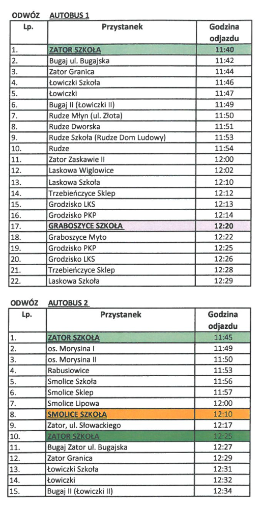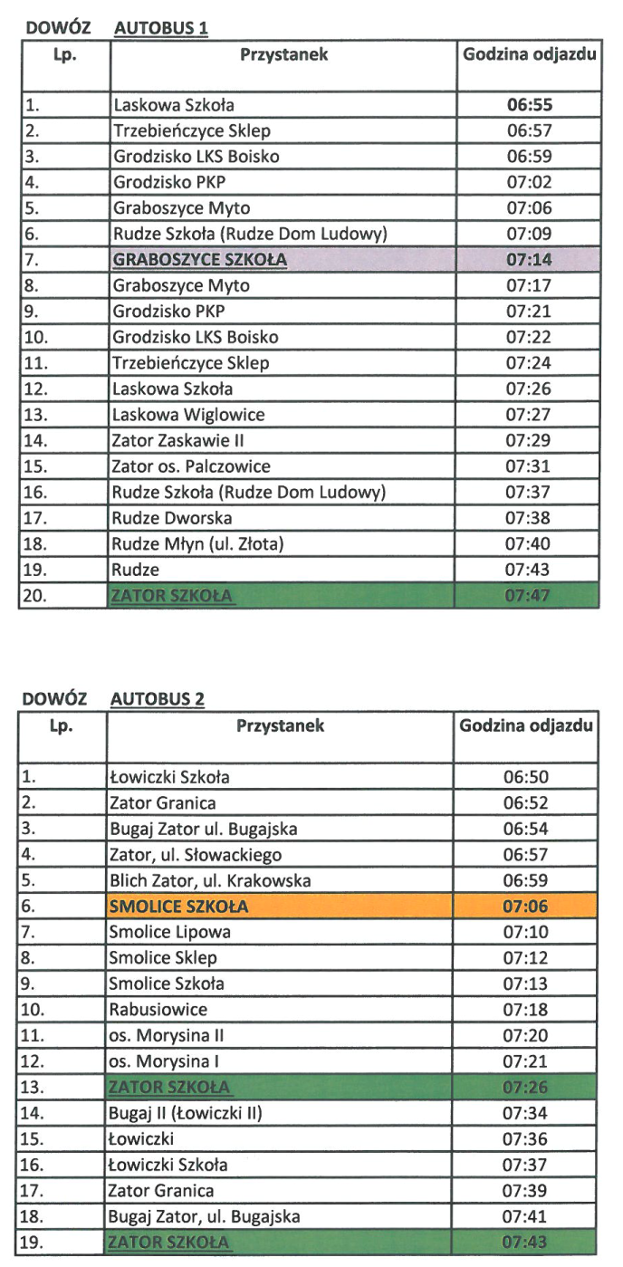 Dowożenie dzieci do szkół na terenie Gminy Zator oraz ich odwożenie w dniu 21.06.2024 r. odbywa się wg. następujących tras: