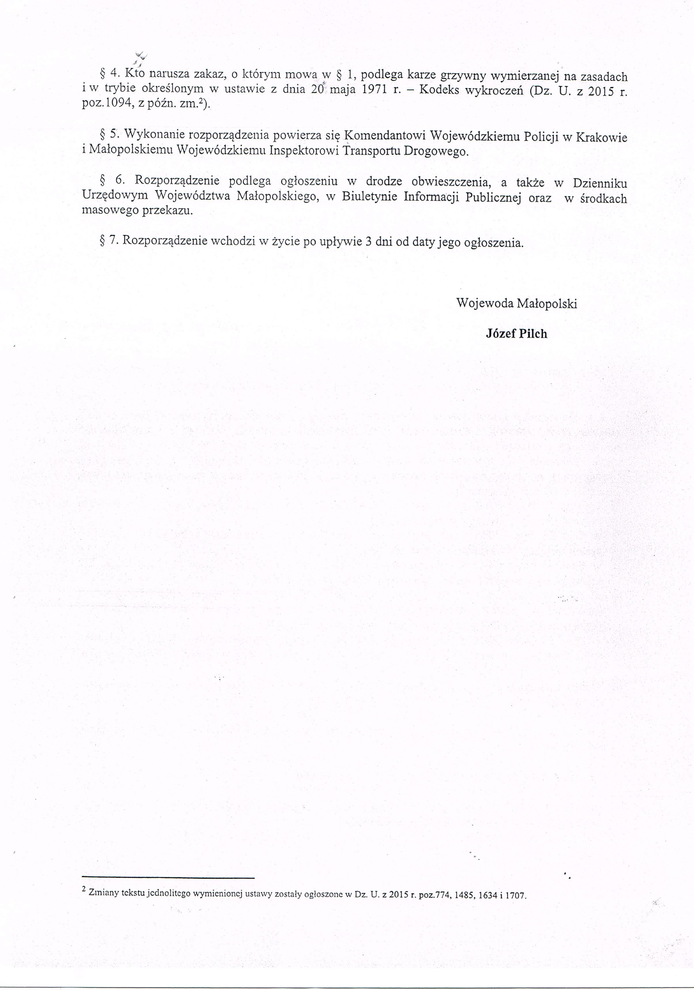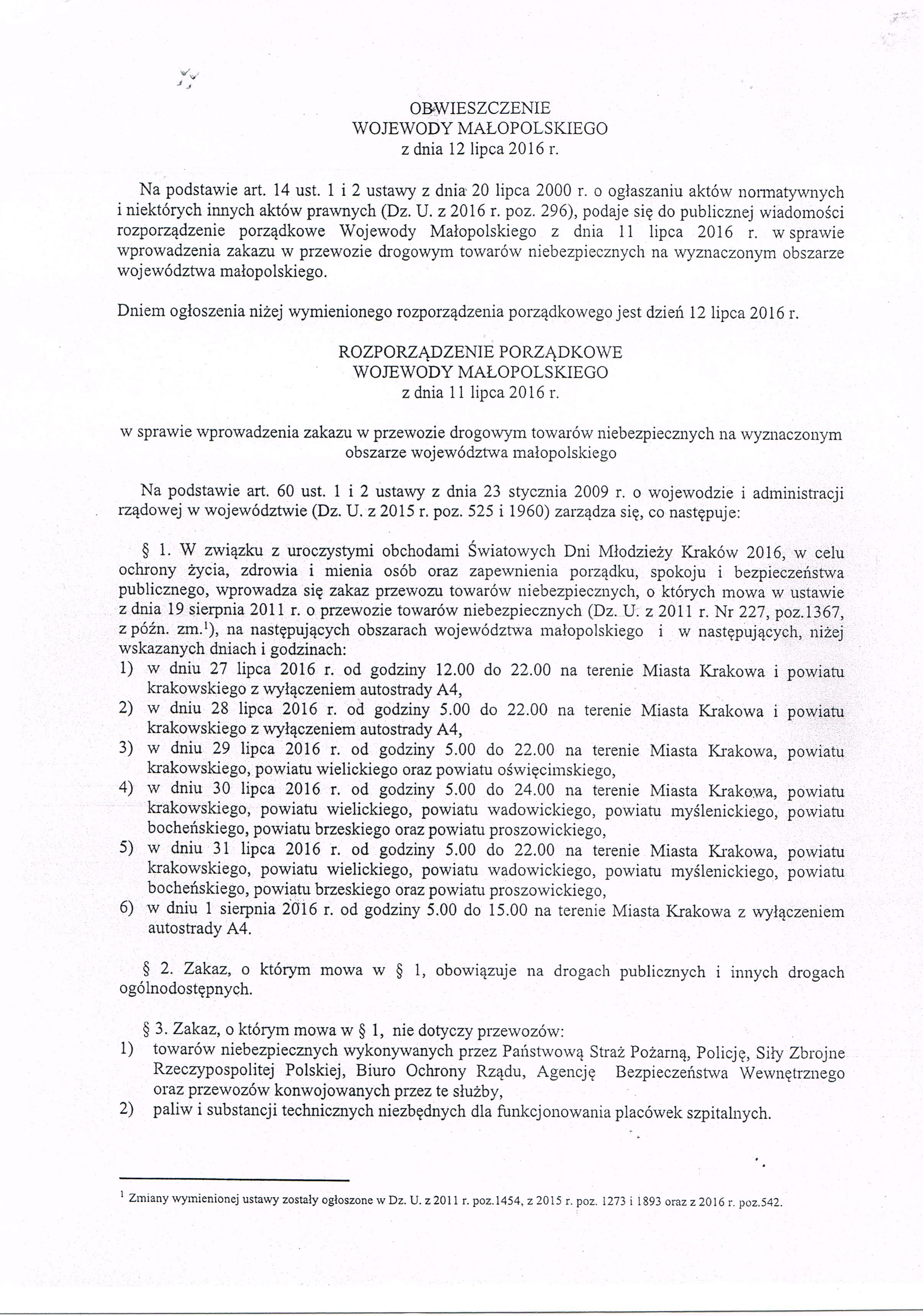 Rozporządzenie Porządkowe Wojewody Małopolskiego z dnia 11 lipca 2016 r. 2016-07-15