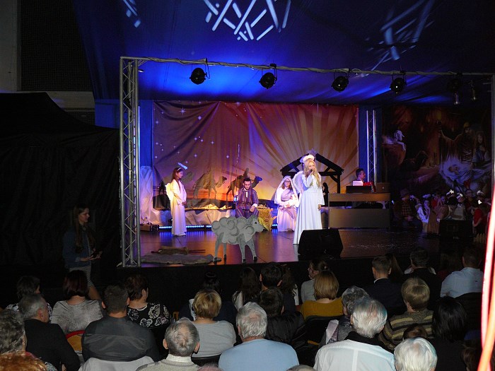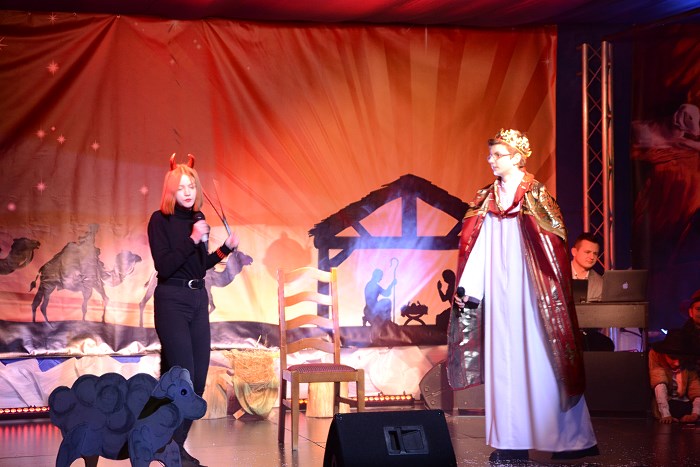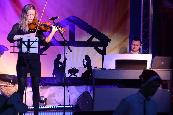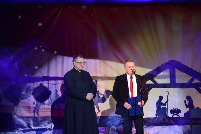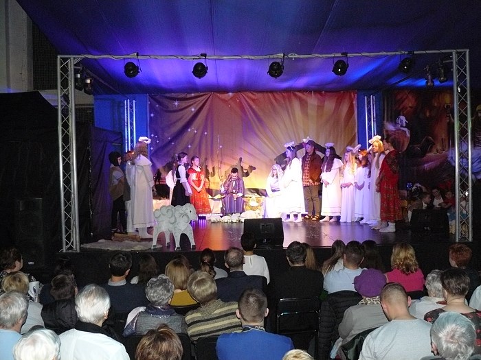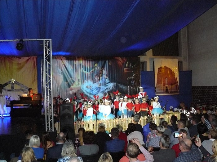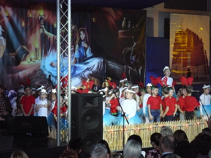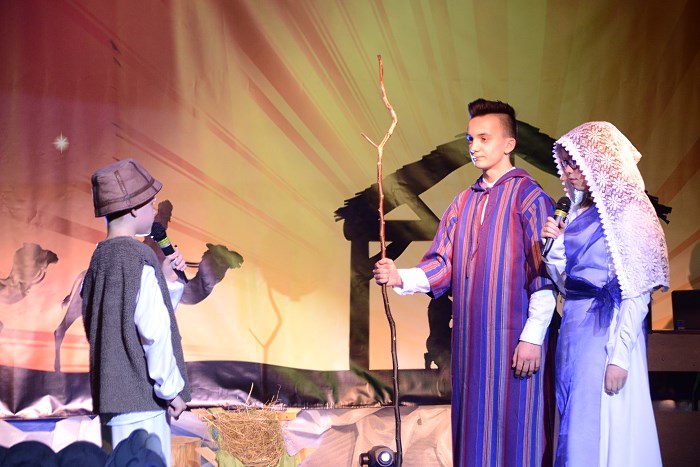 Następnie nadszedł czas na występ wychowanków naszej szkoły. Tradycyjne jasełka w ich wykonaniu były ogromnym przedsięwzięciem, ponieważ wzięło w nich udział wielu młodych aktorów, którzy wykazali się swoimi talentami. Piękne przedstawienie uświetnione było śpiewem szkolnego chóru oraz grą na instrumentach uzdolnionych muzycznie uczniów. Ponadto najmłodsze dzieci-przedszkolaki i uczniowie klas 1-3 w przepięknych strojach bardzo żywiołowo i radośnie zaśpiewały kolędy. Włożyli w ten występ wiele serca i energii, dodając do tego własną choreografię i szeroko uśmiechając się do podziwiających ich rodziców i dziadków.