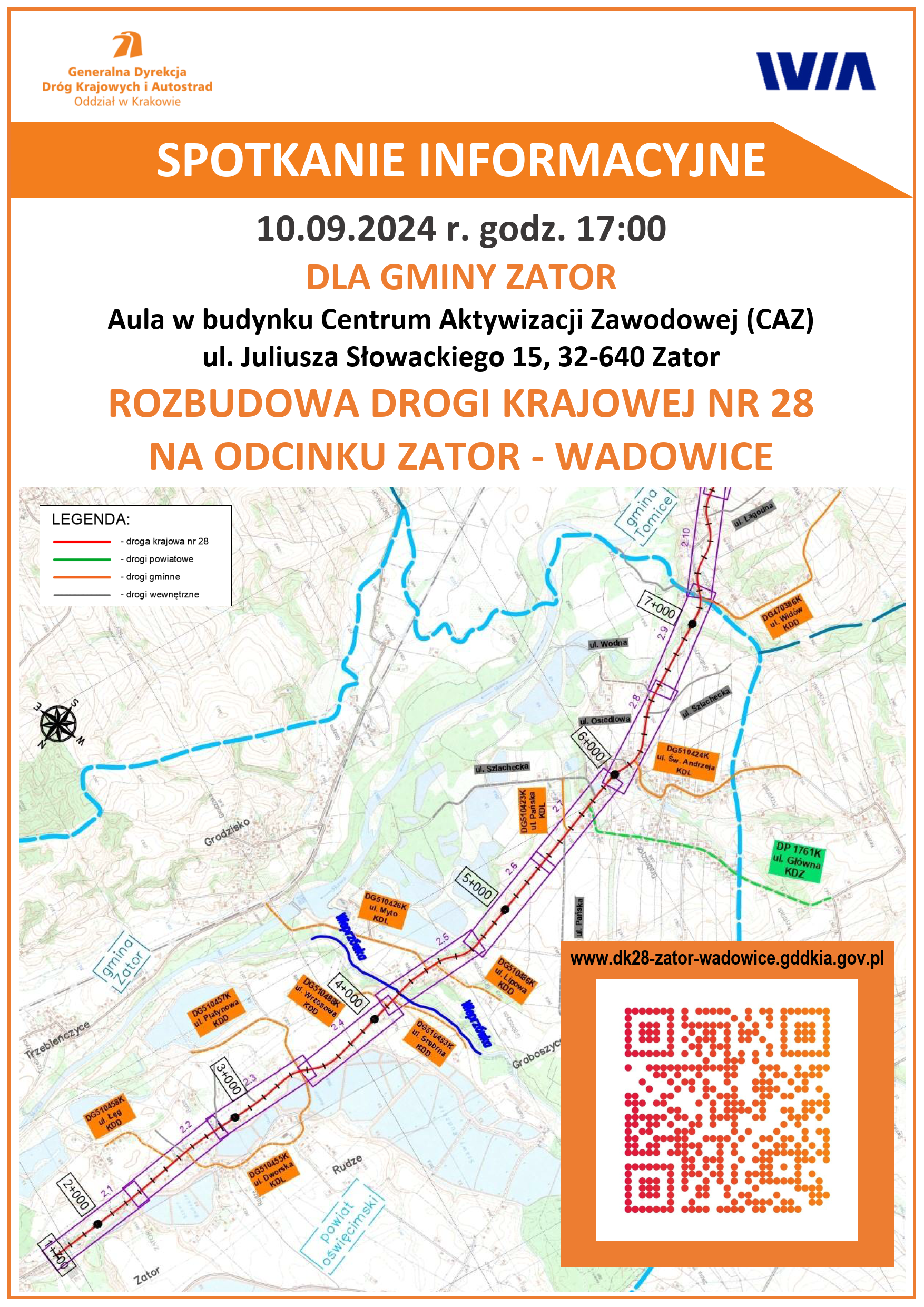 W imieniu Inwestora - Generalnej Dyrekcji Dróg Krajowych i Autostrad zapraszamy mieszkańców Gminy Zator na spotkanie informacyjne w sprawie "rozbudowy drogi krajowej nr 28, na odcinku od skrzyżowania z drogą do PSZOKu w Zatorze do granicy gminy w Graboszycach", które odbędzie się dnia 10 września (wtorek) 2024 r. w godzinach 17:00-20:00 w auli w budynku Centrum Aktywizacji Zawodowej (CAZ) w Zatorze (Adres: 32-640 Zator, ul. Juliusza Słowackiego 15, aula).
