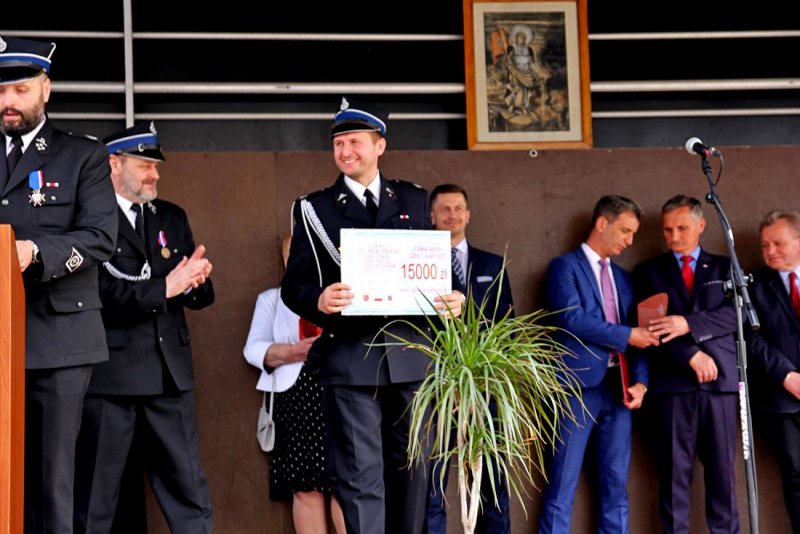 Burmistrz Mariusz Makuch i przewodniczący Rady Stanisław Orlicki przekazali na ręce skarbnika podolszańskiej jednostki Macieja Gielaty czek na kwotę 15 tyś. złotych na zakup niezbędnego sprzętu pożarniczego.