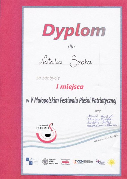 Po raz kolejny uczennica klasy 3 a Szkoły Podstawowej w Zatorze - Natalia Sroka zachwyciła jury Konkursu, które przyznało jej I miejsce w V Małopolskim Festiwalu Pieśni Patriotycznej. Festiwal odbył się 07.06.2017 r. w Wadowichach pod hasłem "Powstań Polsko". Występ Natalii wzbudził ogromne zainteresowanie wśród słuchającej jej publiczności, która zgotowała jej gorące owacje.
