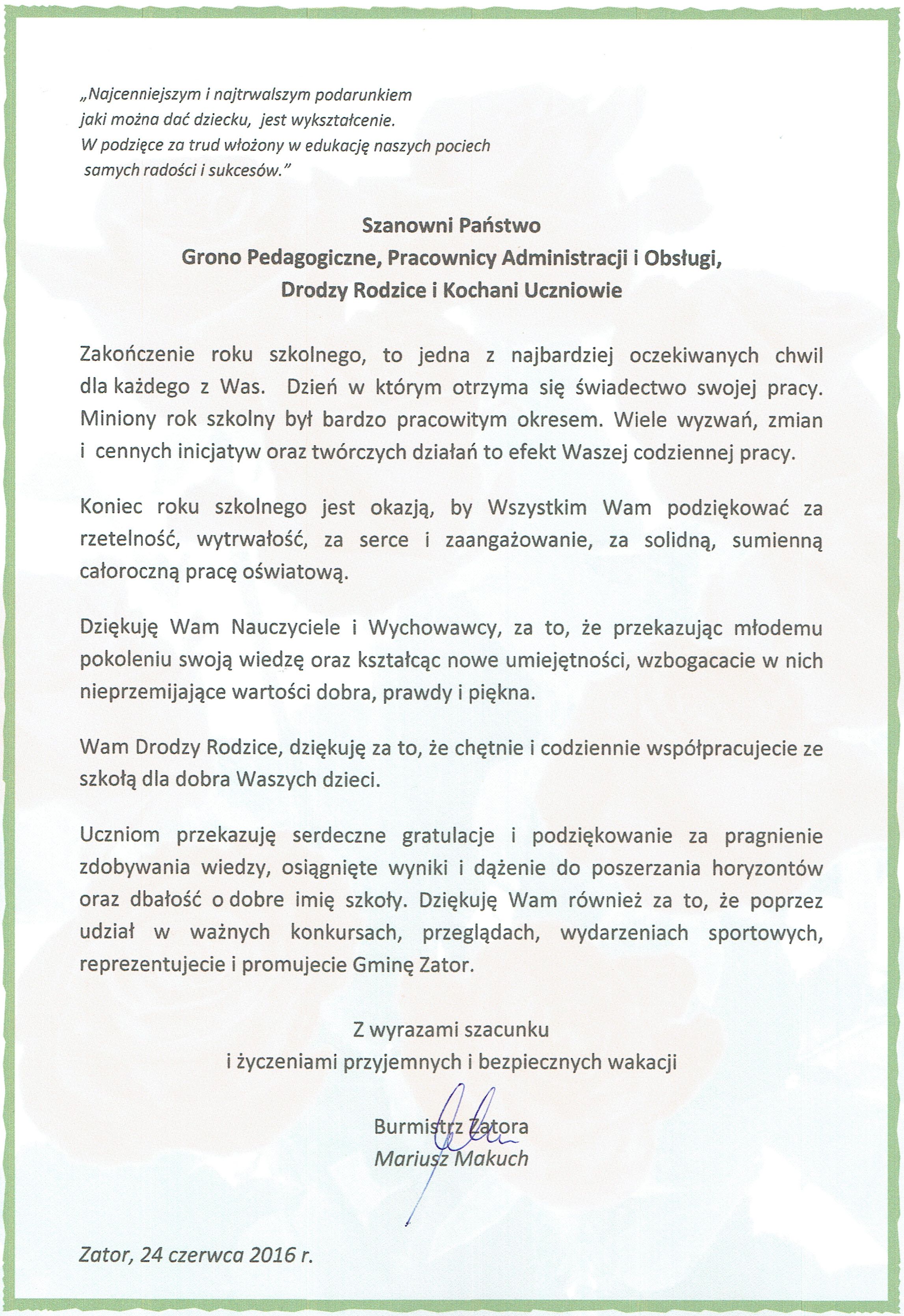 Szanowni Państwo, Grono Pedagogiczne, Pracownicy Administracji i Obsługi, Drodzy Rodzice i Kochani Uczniowie 2016-06-24
