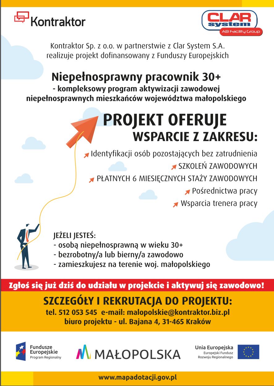 Aktualnie trwa nabór uczestników i uczestniczek do projektu „Niepełnosprawny pracownik 30+ - kompleksowy program aktywizacji zawodowej niepełnosprawnych mieszkańców województwa małopolskiego” realizowanego przez Kontraktor Sp. z o.o. w partnerstwie z Clar System S.A. w ramach Regionalnego Programu Operacyjnego Województwa Małopolskiego na lata 2014-2020, 8 Oś Priorytetowa Rynek pracy, Działanie 8.2 Aktywizacja zawodowa, z Europejskiego Funduszu Społecznego.