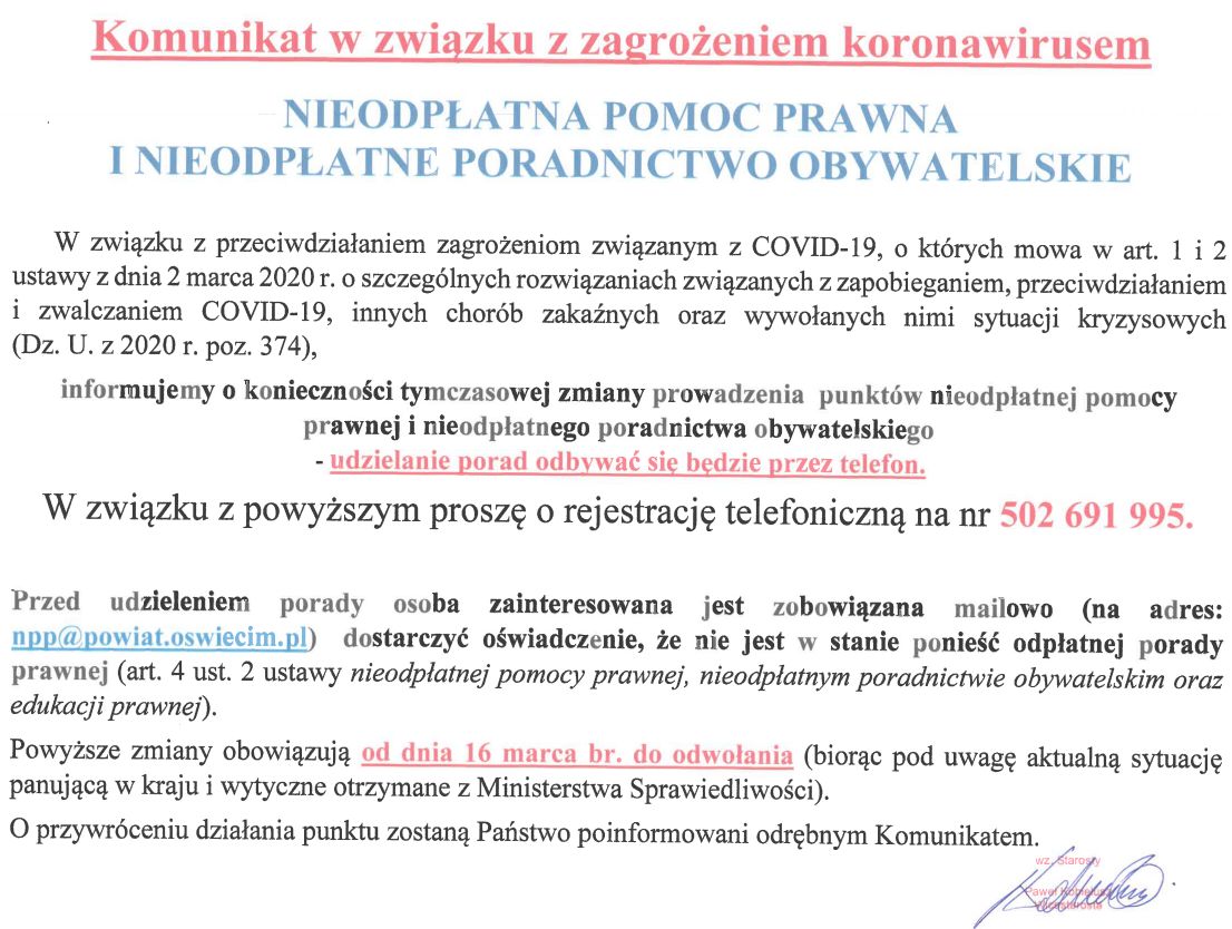 Tymczasowa zmiana zasad prowadzenia Punkt Nieodpłatnych Porad Prawnych 2020-03-13