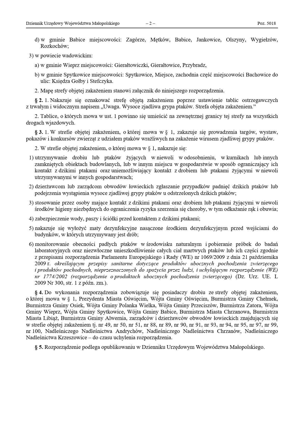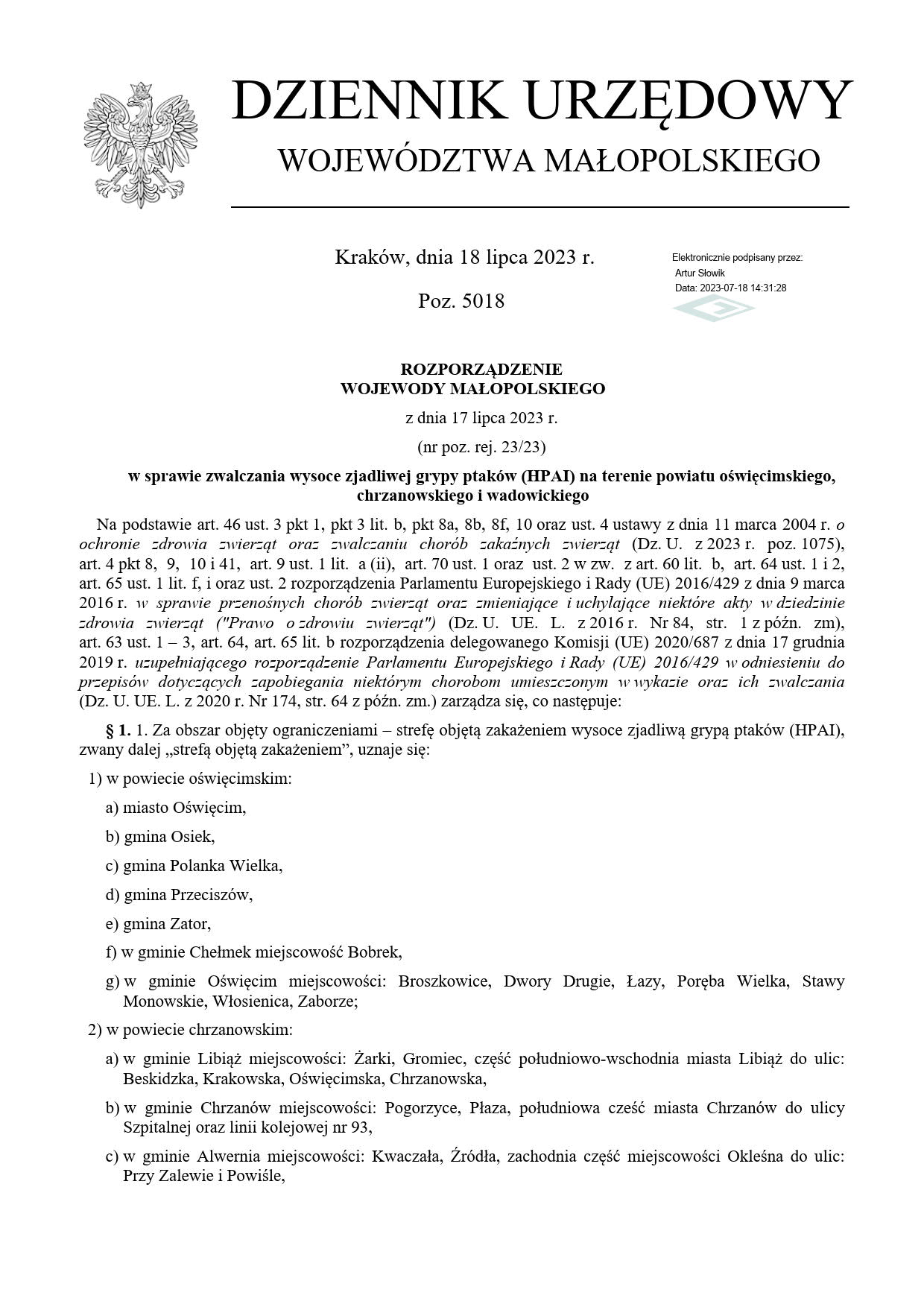 Wydano Rozporządzenie Wojewody Małopolskiego z dnia 17 lipca 2023 r. w sprawie zwalczania wysoce zjadliwej grypy ptaków (HPAI) na terenie powiatu oświęcimskiego, chrzanowskiego i wadowickiego